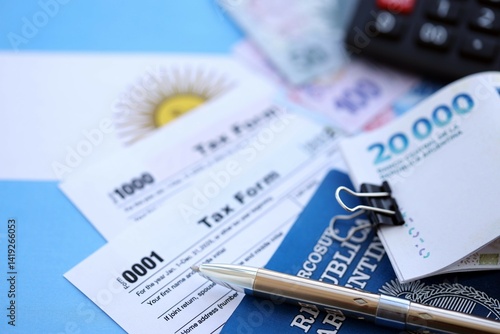 Argentine pesos money bills in big amount lies on table with pen, calculator, passport and tax forms