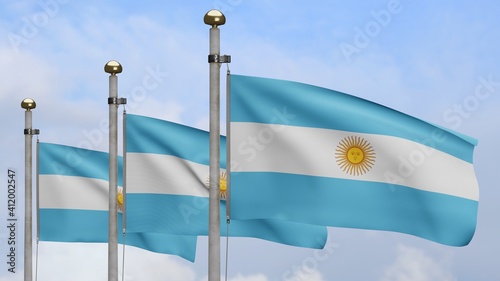 Argentinian flag waving in wind with blue sky. Argentine banner blowing silk.