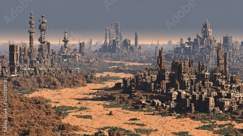 Arid Landscape Digital Rendering of a Post Apocalyptic Desert Cityscape with Crumbling Stone Structures Under a Pale Sunlight