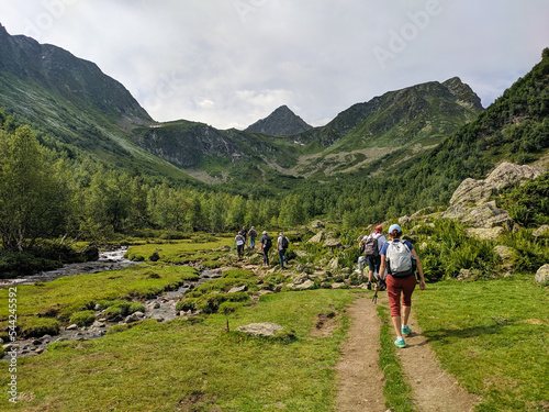 Arkhyz, Karachay-Cherkessia, Russia - August 22, 2022: Beautiful view of the landscape of the Caucasus mountains. People with backpacks in a group cross the stream on the rocks