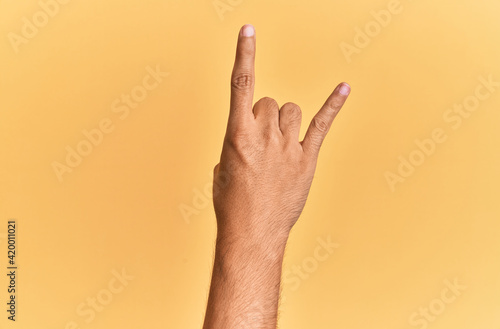Arm and hand of caucasian man over yellow isolated background gesturing rock and roll symbol, showing obscene horns gesture