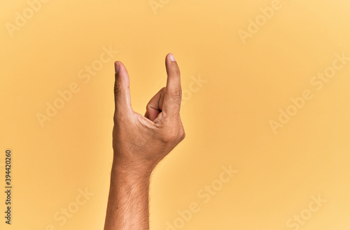 Arm and hand of caucasian man over yellow isolated background picking and taking invisible thing, holding object with fingers showing space
