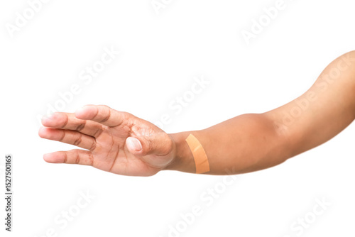 Arm with adhesive bandage displaying an open hand gesture on white backdrop
