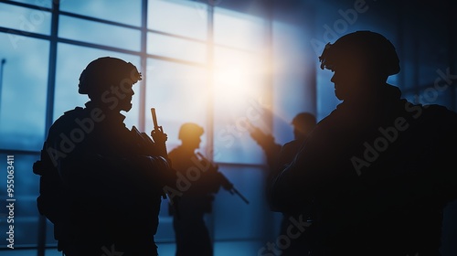 Armed SWAT Police swoop down on a darkened seized office with desks, computers, and rifles. Soldiers move forward and cover the surrounding areas.