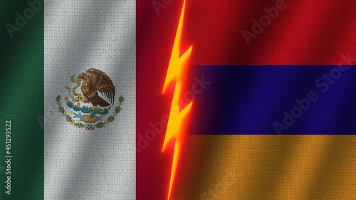 Armenia and Mexico Flags Together, Wavy Fabric Texture Effect, Neon Glow Effect, Shining Thunder Icon, Crisis Concept, 3D Illustration
