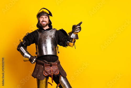 Armor-clad male in vintage outfit against yellow backdrop showcasing medieval and noble fashion