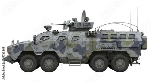Armored military vehicle with camo pattern and satellite dish on transparent background