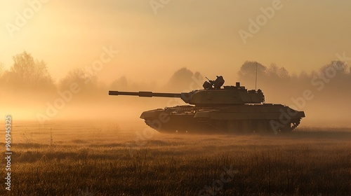 Armored Tank Silhouette Emerging from Foggy Battlefield at Dramatic Sunrise