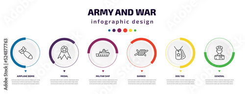 army and war infographic element with icons and 6 step or option. army and war icons such as airplane bomb, medal, militar ship, barbed, dog tag, general vector. can be used for banner, info graph,