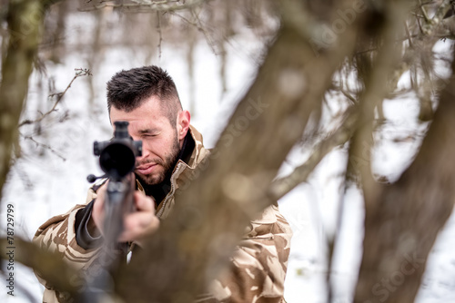 Army trooper with sniper on field, using trees as camouflage