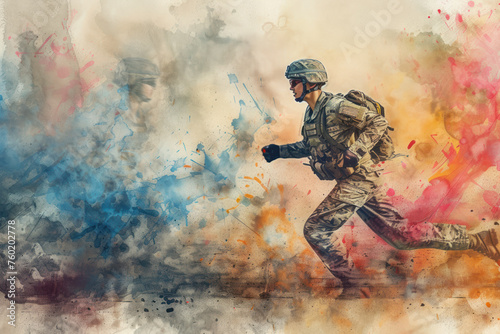 Army woman run in colourful splash watercolor, concept: independence, peace