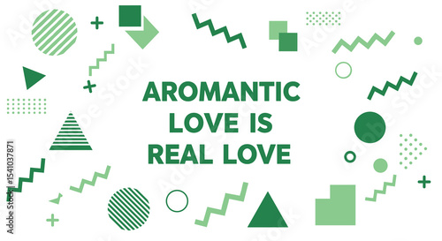 AROMANTIC LOVE IS REAL LOVE. Affirming message with green geometric shapes on a white background. Modern vector illustration for aromantic pride and awareness.