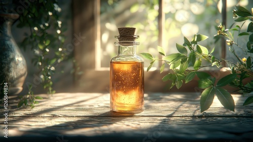 Aromatherapy essence bottle on wood with sunny window backdrop. For wellness content