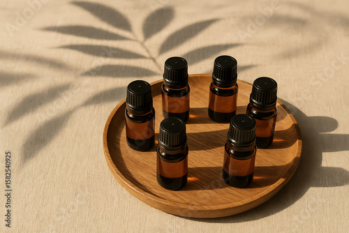 Aromatherapy essential oil bottle amber glass container display mockup on wooden tray with shadow for organic product presentation and wellness branding scene