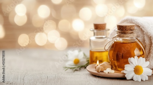 Aromatherapy setup with essential oils, candles, and chamomile flowers on wooden surface