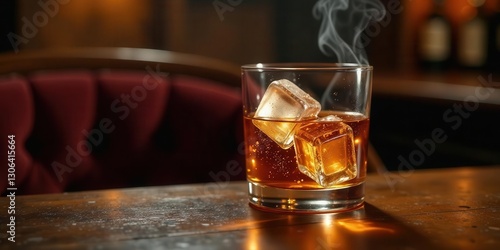 Aromatic amber liquid rests in a rocks glass, two pristine ice cubes melting slowly, wisps of vapor rising from the surface, sitting on a dark wooden table beside a plush upholstered chair.