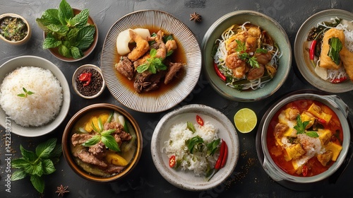 Aromatic Asian cuisine. A delicious spread of flavorful dishes featuring rice, meat, and vibrant vegetables.