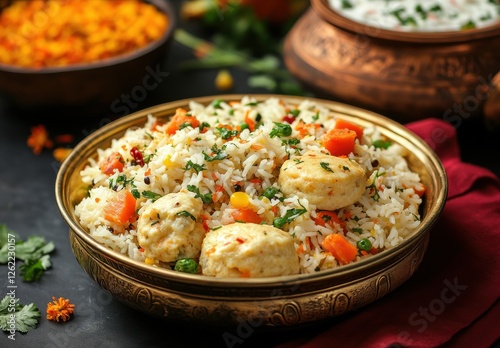 Aromatic Biryani Rice with Colorful Vegetables and Soft Dumplings in a Brass Bowl Surrounded by Traditional Indian Cuisine Décor