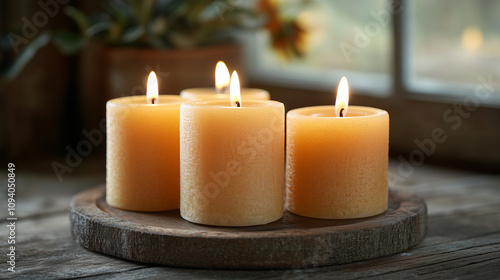 Aromatic candles creating a safe space on a rustic wooden table with a warm glow