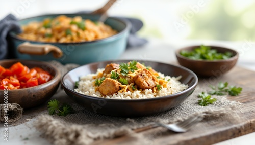 Aromatic Chicken Dish with Rice on a Wooden Board and Garnished with Fresh Herbs and Spices