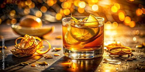 Aromatic citrus cocktail with golden hues in a glass on a wooden surface, bathed in the warm glow of natural light.