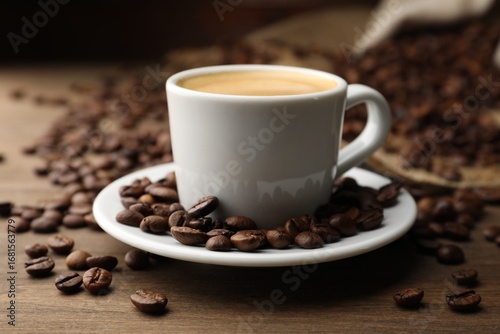 Aromatic coffee in cup and beans on wooden table, closeup