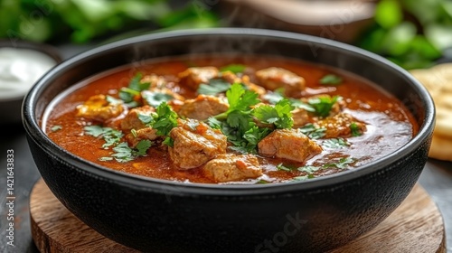 Aromatic curry in a bowl. Steaming, flavorful lamb curry, garnished with fresh cilantro. A rich, vibrant dish served in a dark bowl