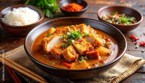 Aromatic curry with crispy fried tofu, served in a dark bowl, alongside a portion of rice.