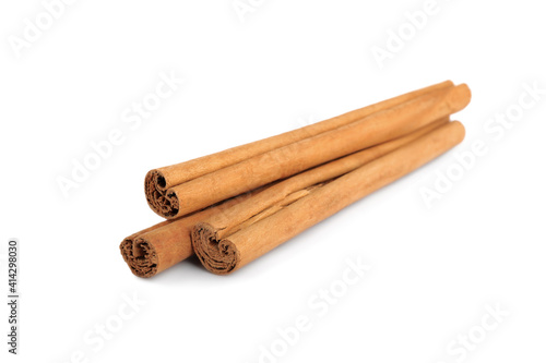 Aromatic dry cinnamon sticks on white background