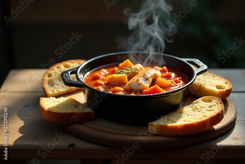 Aromatic Fish Stew with Steaming Broth Served with Crusty Bread on Rustic Wooden Board