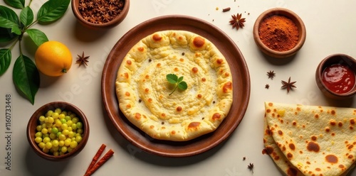 Aromatic flatbread with creamy topping, surrounded by various spices and citrus fruit