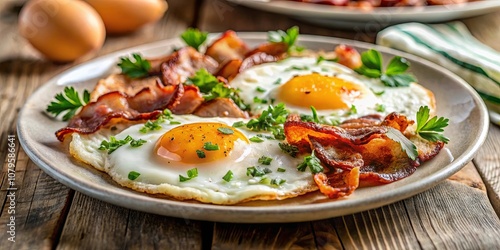 Aromatic Fried Eggs with Crispy Bacon and Fresh Herbs, Adorned with a Delicate Sprinkling of Green Onions on a Rustic Wooden Table