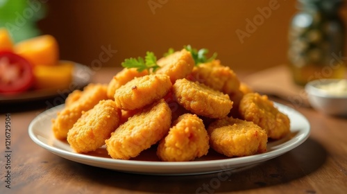 Aromatic golden-brown crispy chicken nuggets served on a pristine white plate, garnished with fresh herbs, a delectable snack or appetizer
