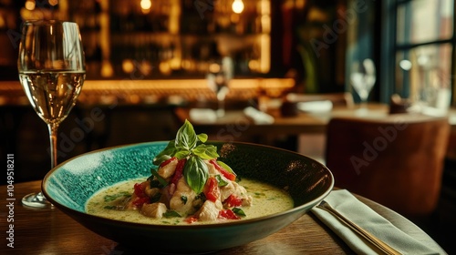 Aromatic Green Curry Chicken Dish in Restaurant Setting
