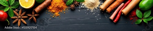 Aromatic herbs and spices scattered on dark wood, seasoning, paprika, garlic