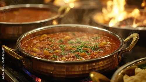 Aromatic Indian curry in copper pot, buffet style, flames and hot food background