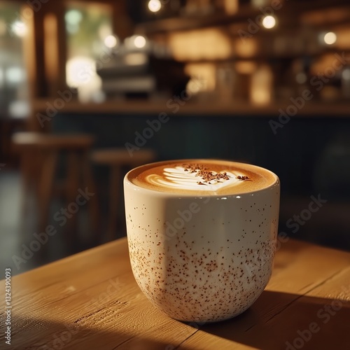 Aromatic latte in a cozy cafe. A beautiful, textured mug with a latte art design sits on a wooden table in a warm, inviting cafe