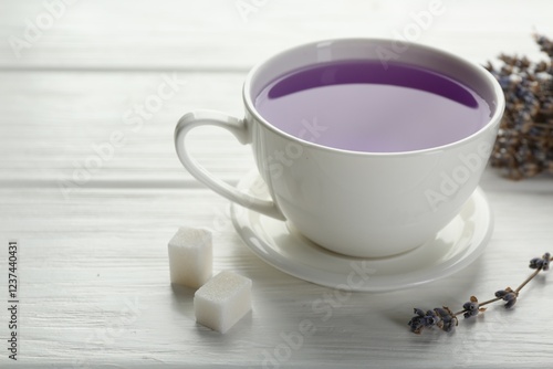 Aromatic lavender tea in cup, sugar cubes and dry flowers on white wooden table, closeup. Space for text