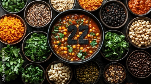 Aromatic Lentil Stew Surrounded By Various Grains And Herbs