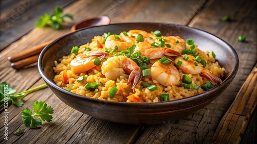 Aromatic Rice Dish with Shrimp and Green Onions, Served in a Rustic Bowl on a Weathered Wooden Table