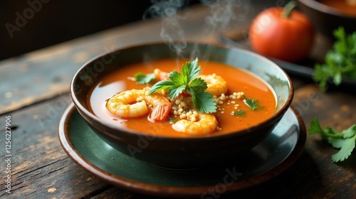 Aromatic Shrimp and Tomato Soup with Steaming Broth and Fresh Herbs in a Rustic Bowl