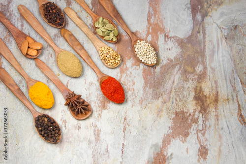 Aromatic spices on wooden spoons. Food ingradients.