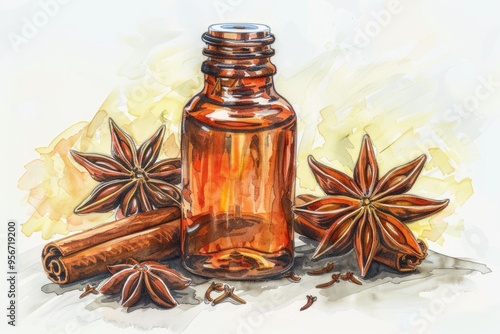 Aromatic Star Anise Essential Oil. Hand-Drawn Watercolor Illustration for Spa and Wellness