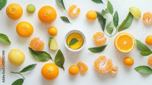 Aromatic tangerine essential oil surrounded by fresh citrus fruits and green leaves on a clean white background for wellness and beauty themes