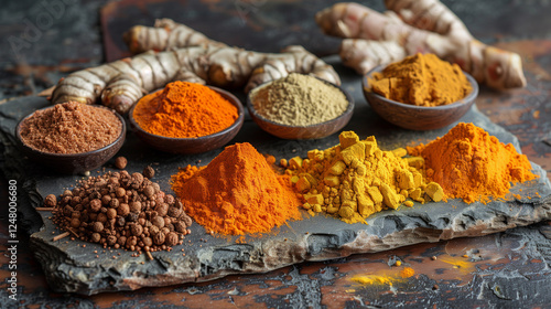 Aromatic turmeric powder and raw roots on wooden table, closeup