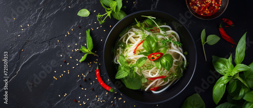 Aromatic Vietnamese pho; a symphony of rice noodles, fresh herbs, and chili, elegantly presented on a slate backdrop