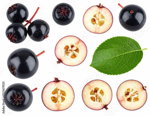 Aronia Berries High-Resolution Images of Fresh Aronia Berries, Cross-Sections, and Leaf