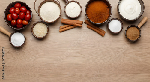 Arrangement of culinary ingredients on a wood surface creates a kitchen still life emphasizing organic elements and warm hues, ideal for showcasing culinary inspiration and healthy eating concept