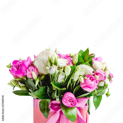 Arrangement of flowers in a hat box. Bouquet of pink and white peonies, eustoma, spray rose in a pink box with an oasis isolated on a white background with copy space