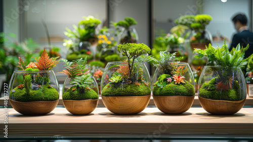Arrangement of moss terrariums and kokedama in round glass bowls with flowers and greenery on wooden table in indoor botanical exhibition, featuring natural textures and diverse plant compositions.